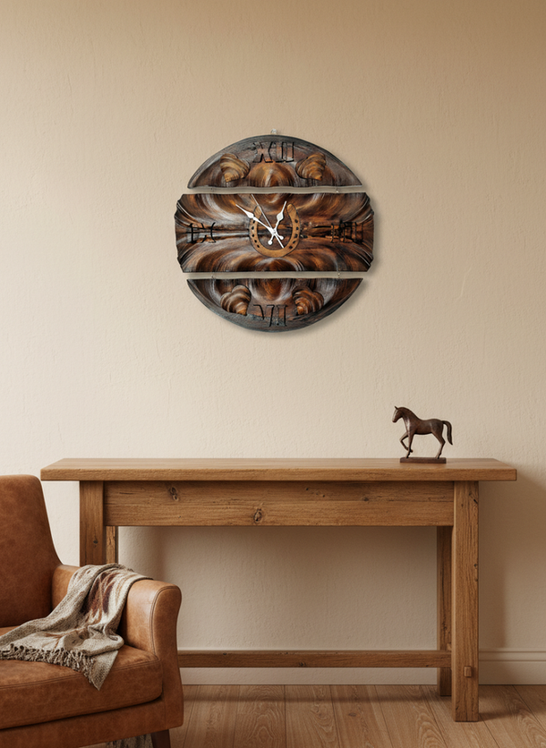 This exquisite handcrafted wooden wall clock is inspired by nature and craftsmanship. Every detail is carefully carved, and the presence of a horseshoe adds not only beauty, but also symbolism, calling for good luck and prosperity. This clock will be a great addition to your interior and will be a wonderful gift for lovers of beautiful things and craftsmanship.