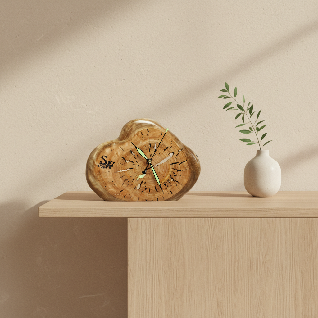 A natural statement desk clock that brings warmth, individuality, and organic elegance into your interior.